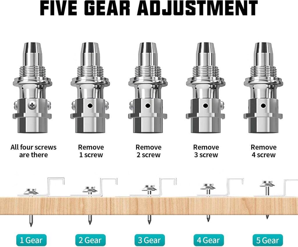 Our nail gun is compact and portable. One-button trigger for continuous nailing, dramatically improve the work efficiency; 5 levels of power adjustable, not afraid of hard objects, easily penetrate wood, concrete, steel plate and other materials, easy to use in a variety of scenarios, is a good helper for engineering installation. Dual silencers reduce noise and protect your ears during the work process. Perfect for indoor equipment installation, this tool is designed to provide convenience and efficiency.